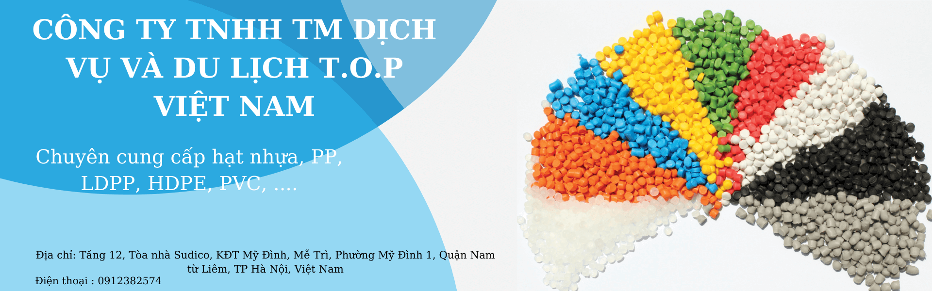 – CÔNG TY TNHH TM DỊCH VỤ VÀ DU LỊCH T.O.P VIỆT NAM là một trong những công ty nhựa Việt Nam với nhiều năm kinh nghiệm, bề dày lịch sử phát triển, chuyên sản xuất, kinh doanh, xuất nhập khẩu hạt nhựa nguyên sinh. Từ khi thành lập cho đến nay công ty đã thiết lập được một mạng lưới và mối quan hệ vững chắc với các tập đoàn sản xuất, nhà máy, công ty cũng như các đại lý phân phối trong và ngoài nước. – Với sự tận tâm của mình công ty nỗ lực đem lại sự hài lòng đối với quý khách hàng của công ty. Công ty gửi lời cám ơn chân thành tới quý khách đã quan tâm, tin tưởng và sử dụng. – Các loại hạt nhựa nhập khẩu, hạt nhựa nguyên sinh , một số ngành hàng hóa chất CÔNG TY TNHH TM DỊCH VỤ VÀ DU LỊCH T.O.P VIỆT NAM kinh doanh gồm : hạt nhựa PP, hạt nhựa LDPE, hạt nhựa LLDPE, hạt nhựa HDPE, Bột nhựa PVC, PET, hóa chất Butyl axetat , hóa chất Toluen mixture , MEK …